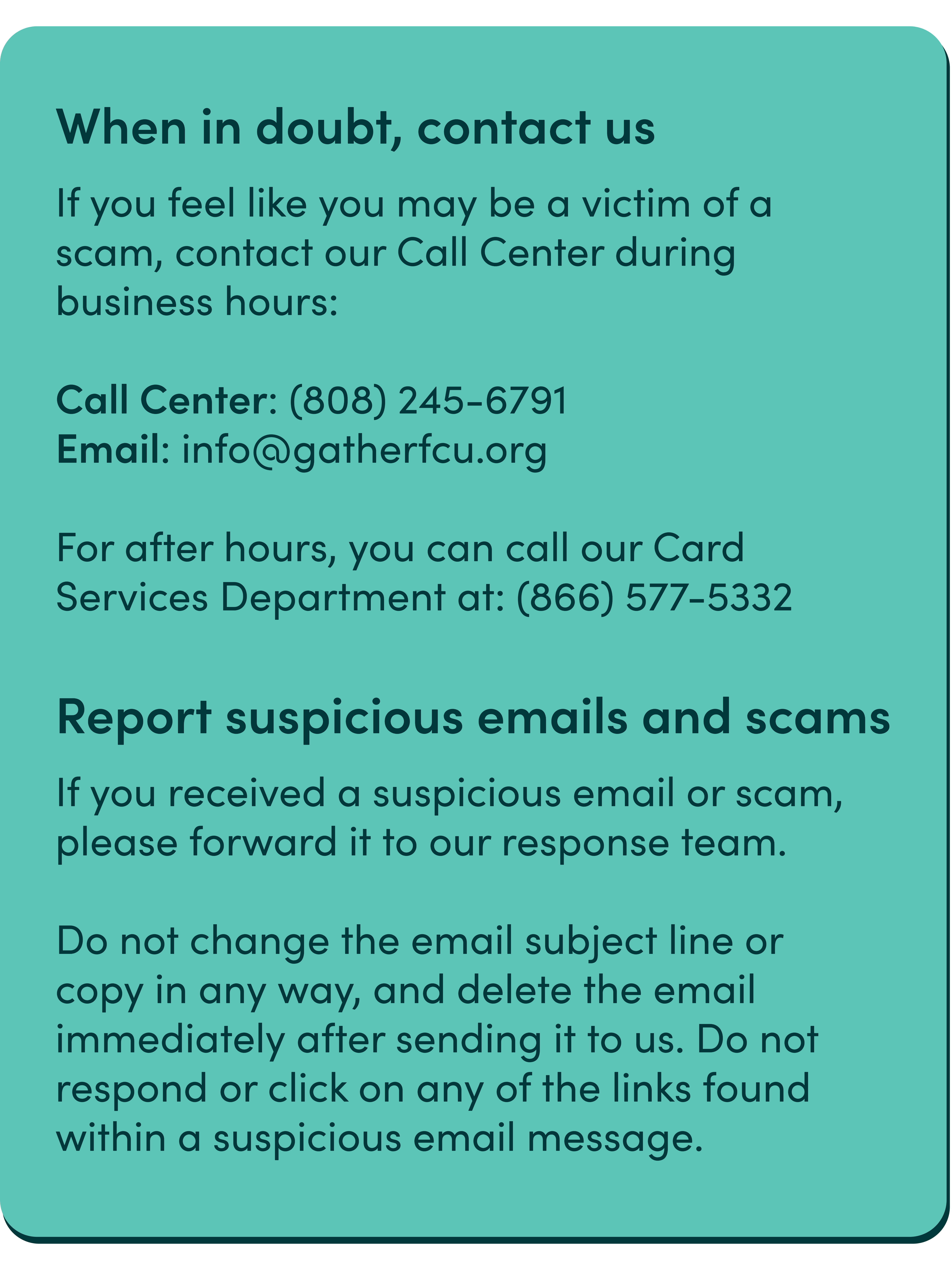 They can even spoof caller IDs to appear as "Gather Federal Credit Union" or "Gather FCU." If you receive an unsolicited request for sensitive information, hang up or ignore the message. Stay cautious and never share personal details.